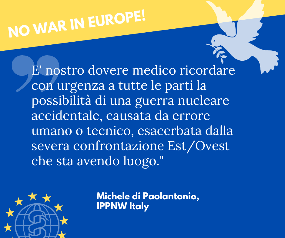 Il co-vicepresidente regionale per l’Europa di IPPNW, la dott.ssa Angelika Claussen, ha commentato: “La nostra responsabilità come medici e operatori sanitari è salvare vite umane attraverso un’azione preventiva. Ecco perché dobbiamo agire per fermare un’altra guerra in Europa che potrebbe facilmente trasformarsi in una guerra nucleare”.